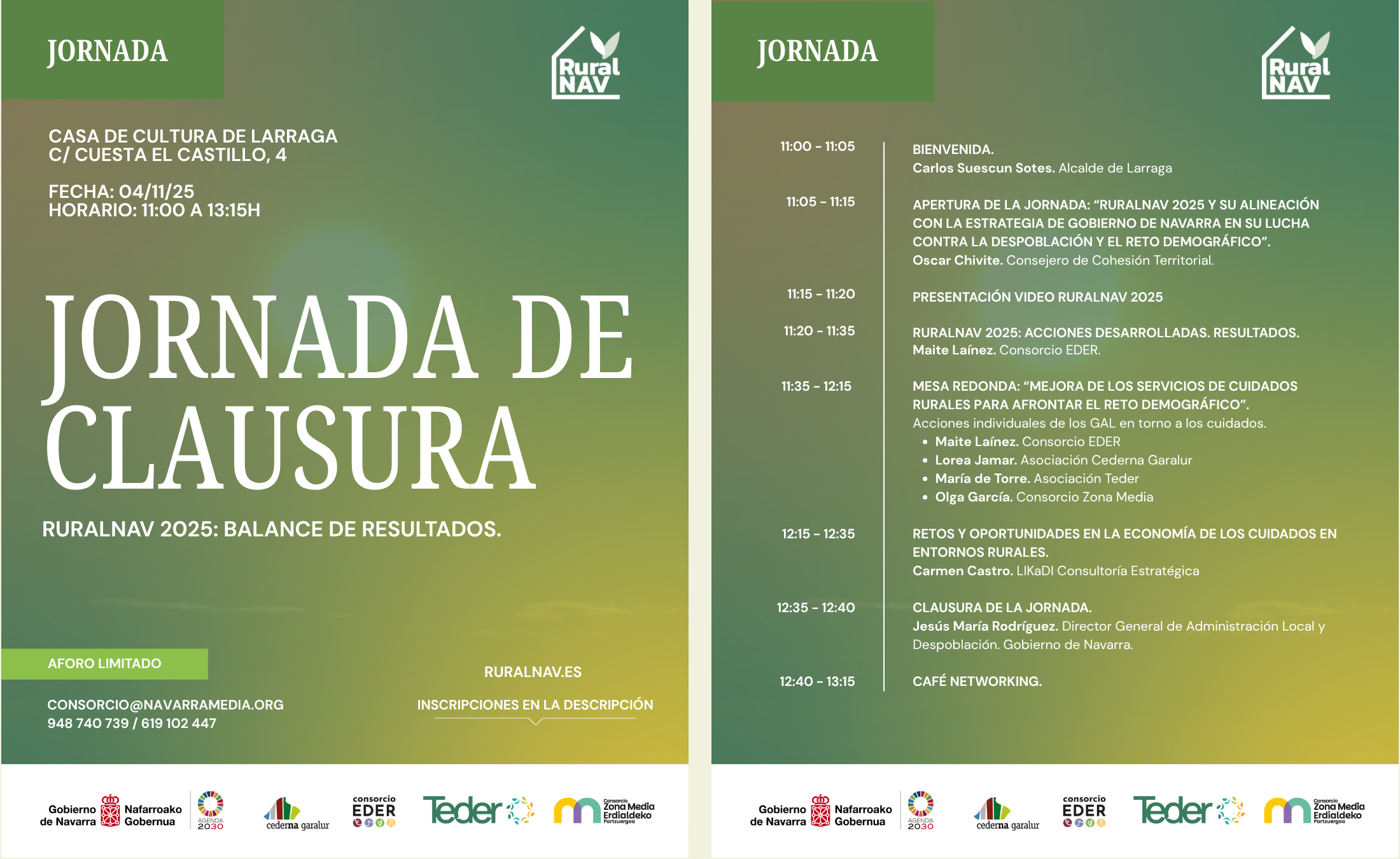 El programa RuralNav 2025, impulsado por la Dirección General de Administración Local y Despoblación y desarrollado por los Grupos de Acción Local (GAL) de Navarra, celebrará su jornada final el martes 4 de noviembre, de 11:00 a 13:15 horas, en la Casa de Cultura de Larraga.